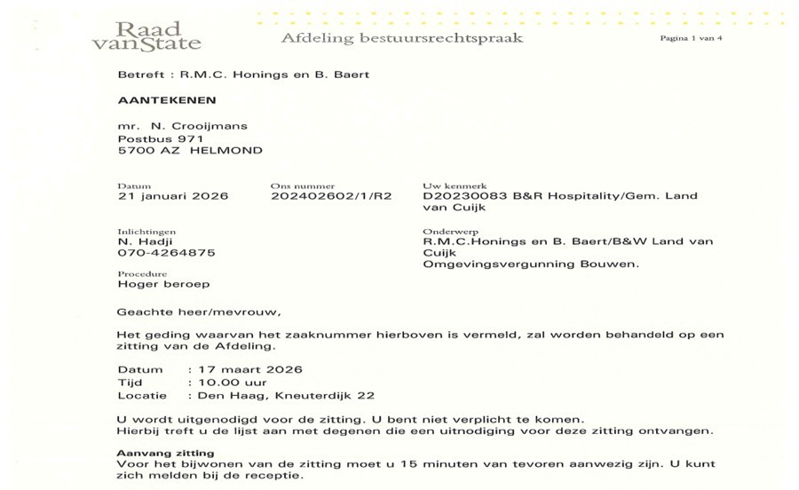 We wachten ( al weer 1,5 jaar) op een zittingsdatum bij de Raad van State in Den Haag (verwachting nu voorjaar 2026) i.v.m. weigering vergunning van onze aanvraag voor een B&B voor 4 personen. Dit na eerst meer dan 5 jaar gedogen door Gemeente Land van Cuijk.